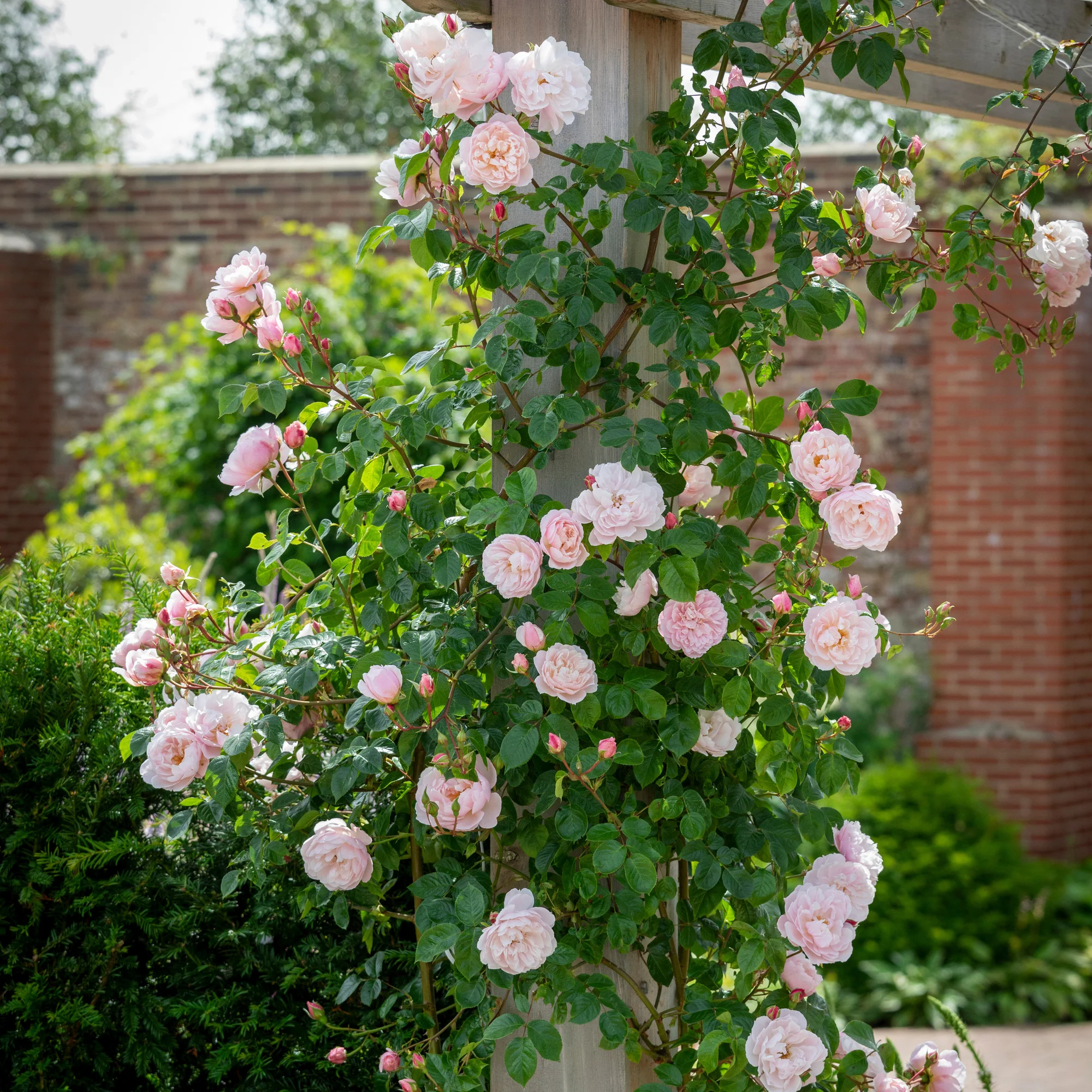 Bears beautifully formed flowers, which nod gracefully on the stem. When the petals open they expose numerous stamens, providing an almost water lily-like effect. The flowers are a pale glowing pink and have a delicious fragrance with aspects of Old Rose, musk and myrrh.
